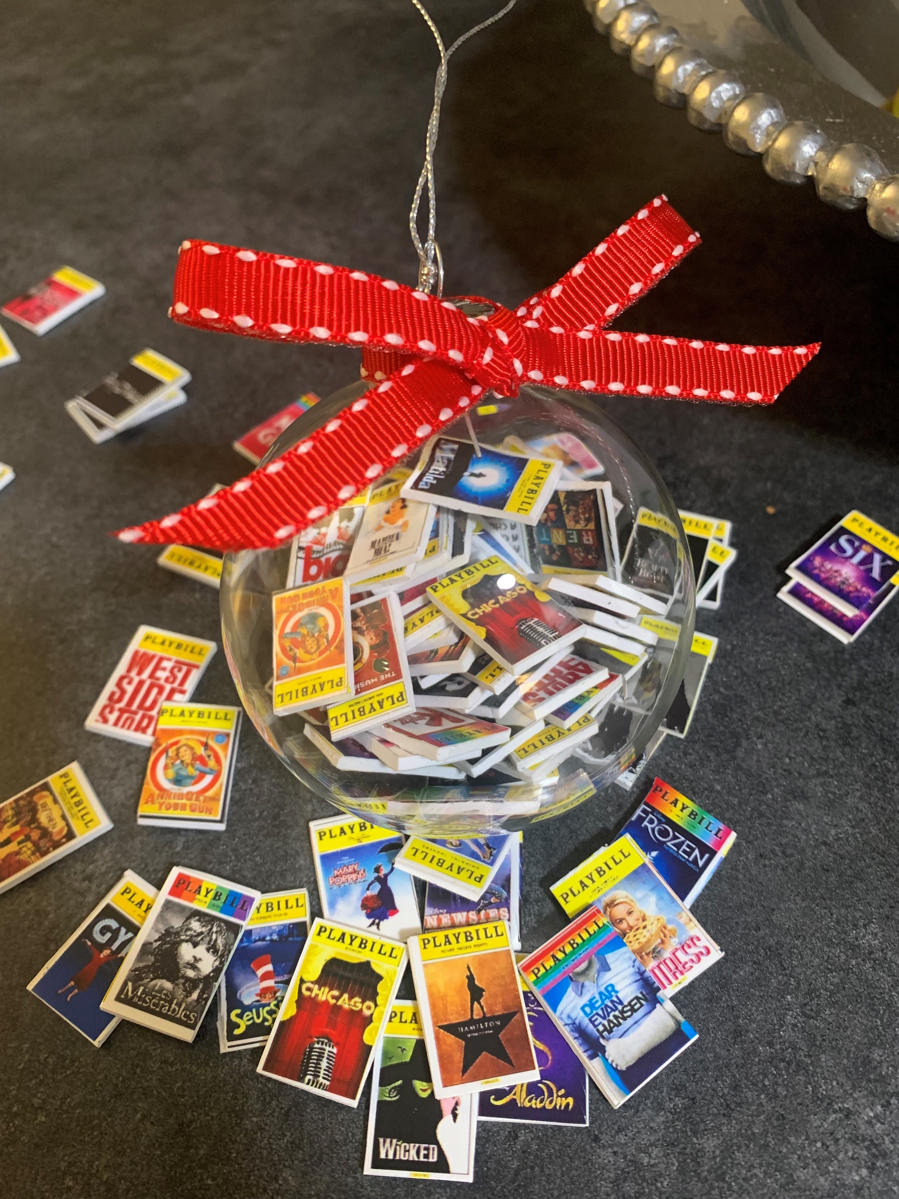 Kim is making these glass ornaments and acrylic boxes filled with your choice of Broadway Playbills, books, movies, albums, video games, children’s books, Harry Potter doodads, Mah Jong tiles, really anything you can think of! She sells them through her Etsy shop, facebook, email, craft fairs and text. The latest hot sellers are filled with the last several seasons of The Muny and Fabulous Fox shows. Shows or books can be added as your collection or experiences grow as the top will pop off the ornament, and the acrylic boxes have removable lids. You can order them filled with the most popular titles or your custom list.