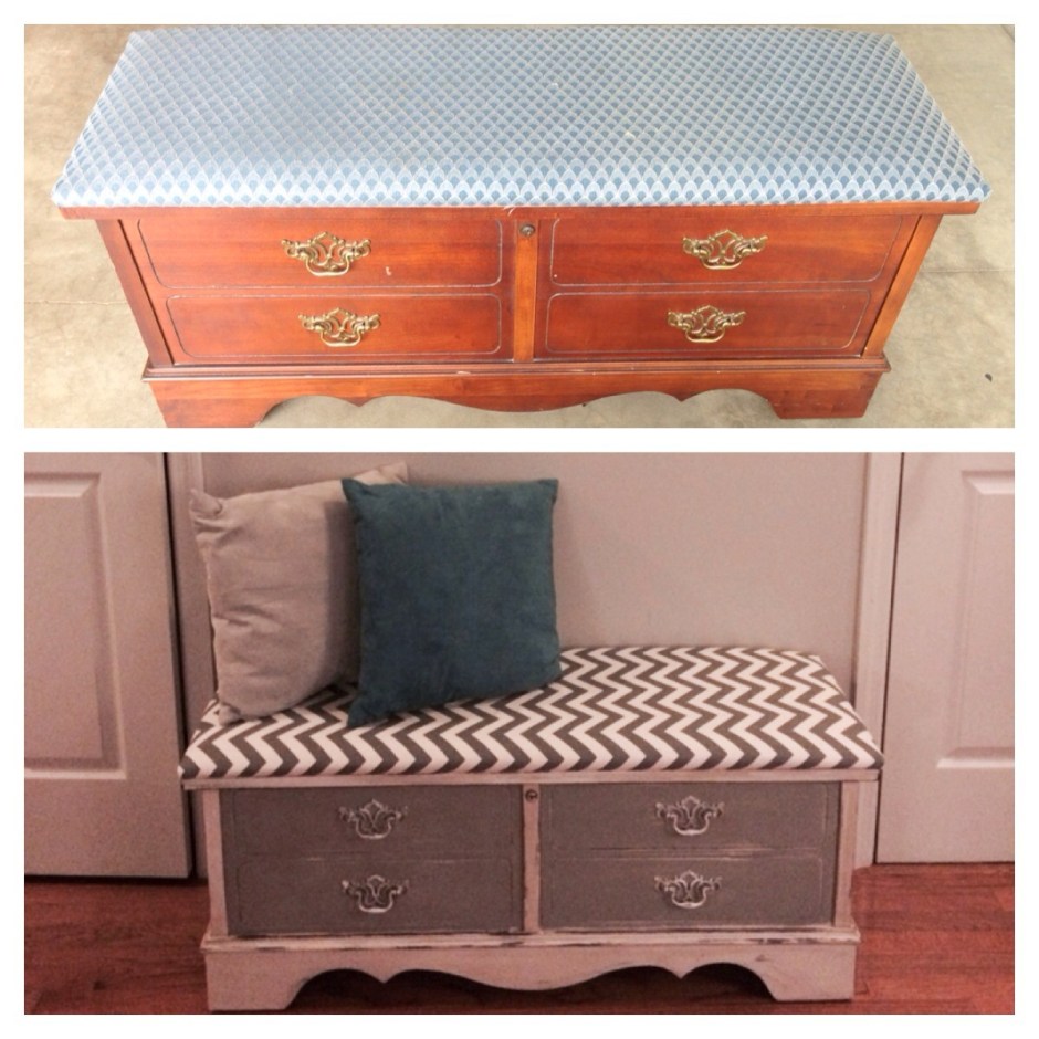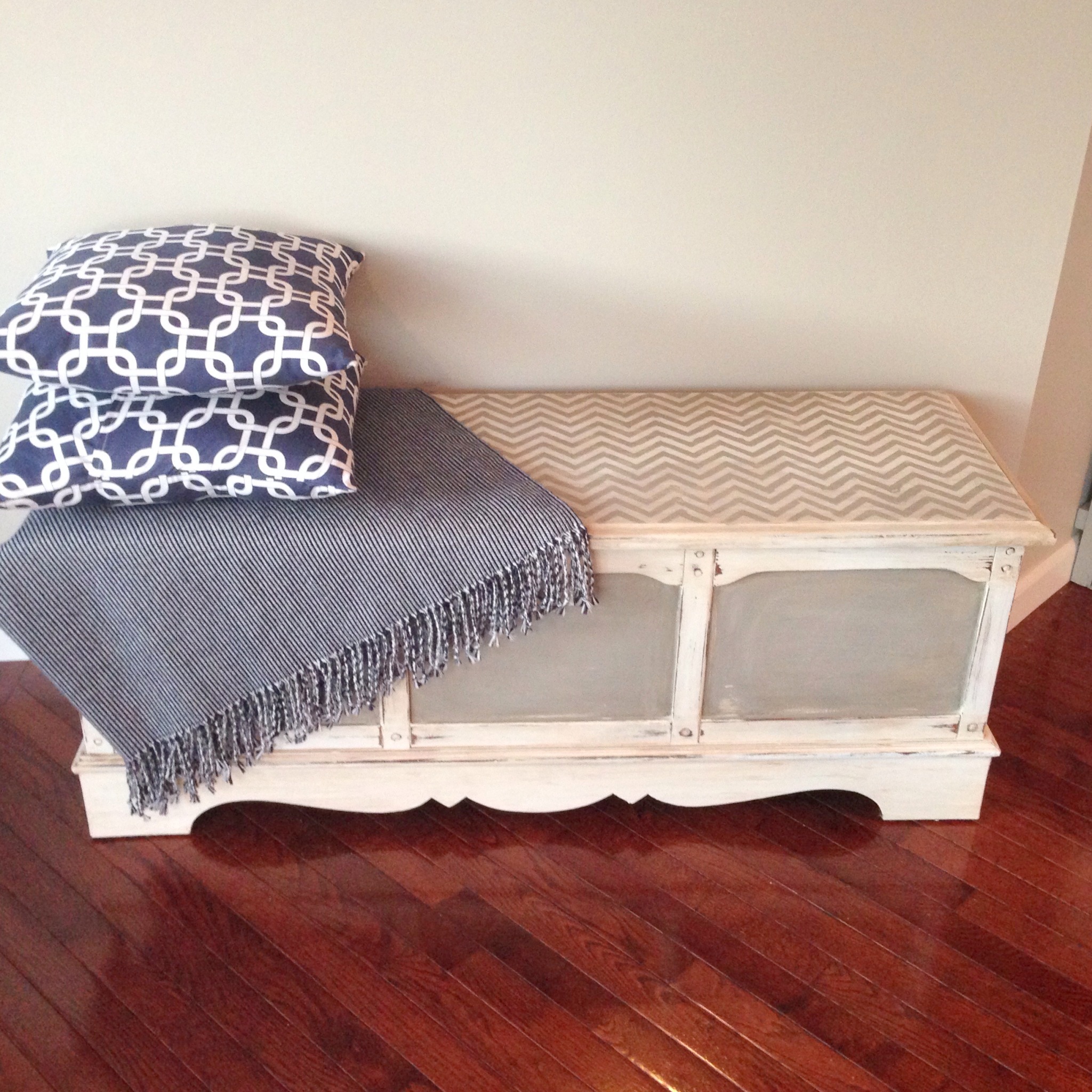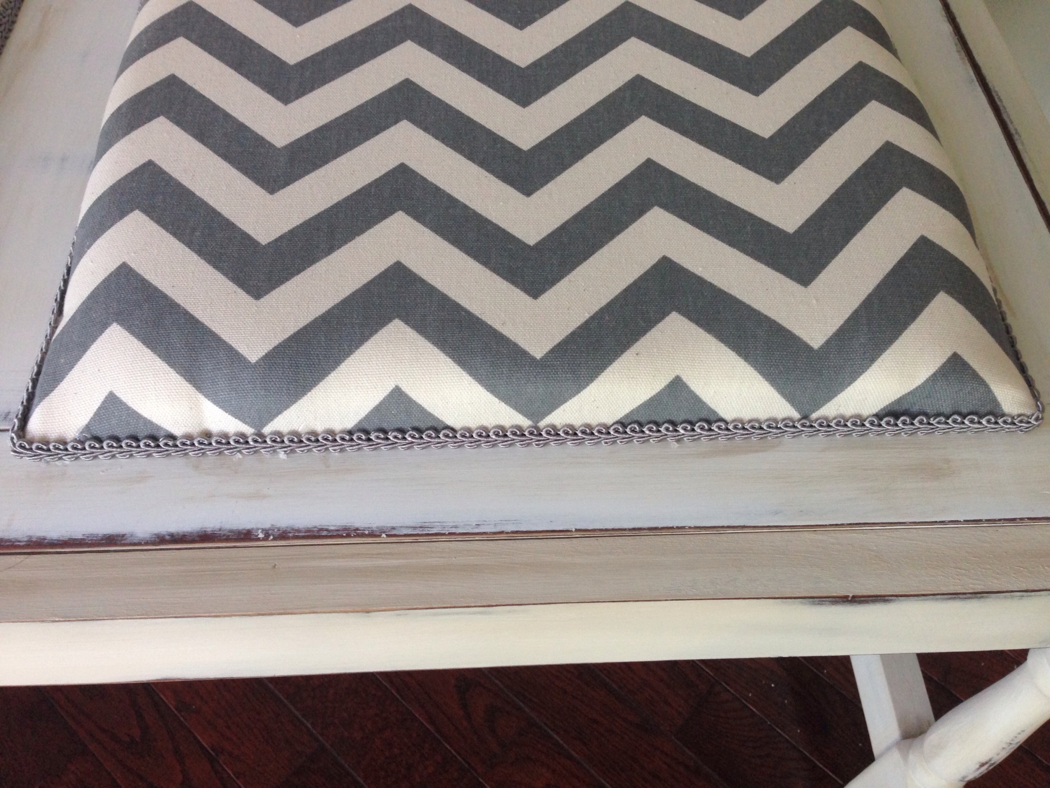 Now to reupholster this piece….All I have to say is thank God my Dad was staying with me while he is in transition of moving to Florida. He sat and removed every single staple from the old upholstery. THANK YOU DAD! That was probably the hardest part of this makeover. Once he removed the old fabric we realized that none of the foam or wood could be reused. It was completely shot. My dad took the plywood to Lowe’s and they custom cut two new pieces for us. He then went to Hobby Lobby to pick up new foam. We quickly got to work replacing the entire seat. It is so much more comfortable and sturdy now. I added a decorative trim around the fabric to hide the nails and give it a little more pizazz. I just love the way it turned out. What a difference some paint and new fabric can make. My oldest daughter is trying to hijack this piece for her room. I need to sell it while she is at school:-) I think it would be great as a bench in a living room or entry way. It would be perfect in a mud room as well. Just adorable. Right now it is sitting at the end of my daughters bed and it does look like it belongs there. 🙂 If it doesn’t sell I know it was meant to be right where it sits now.