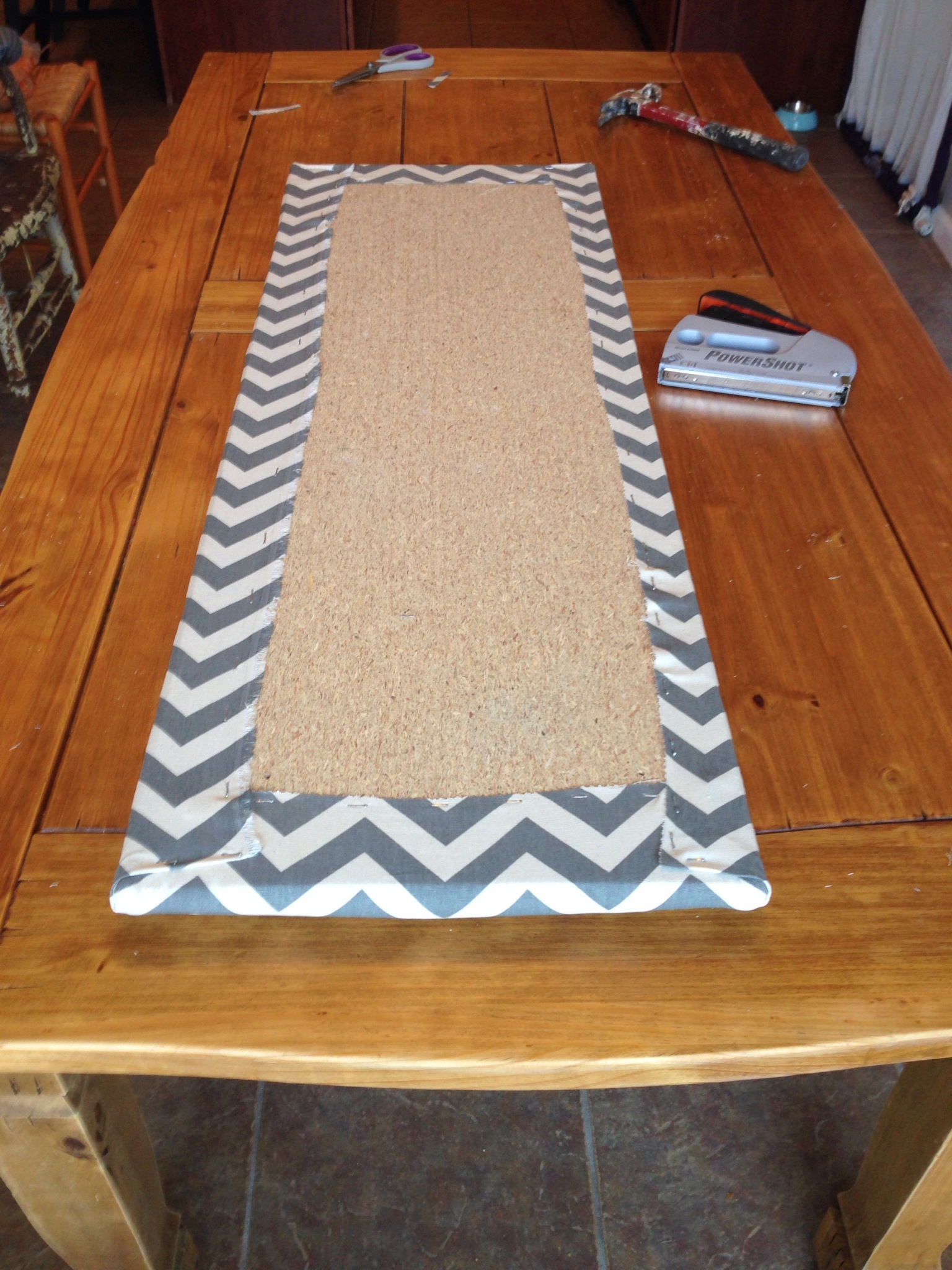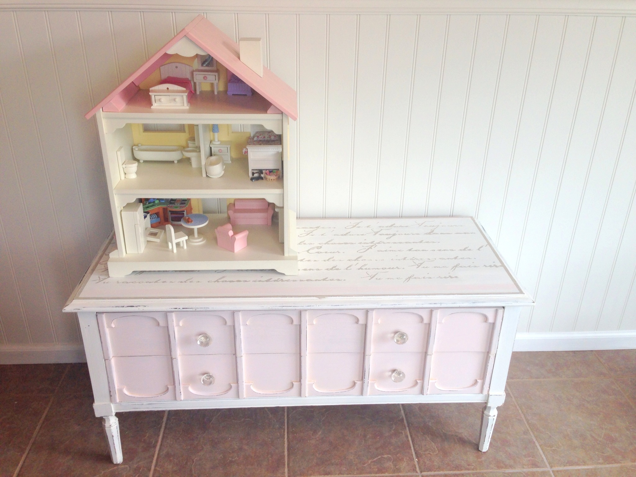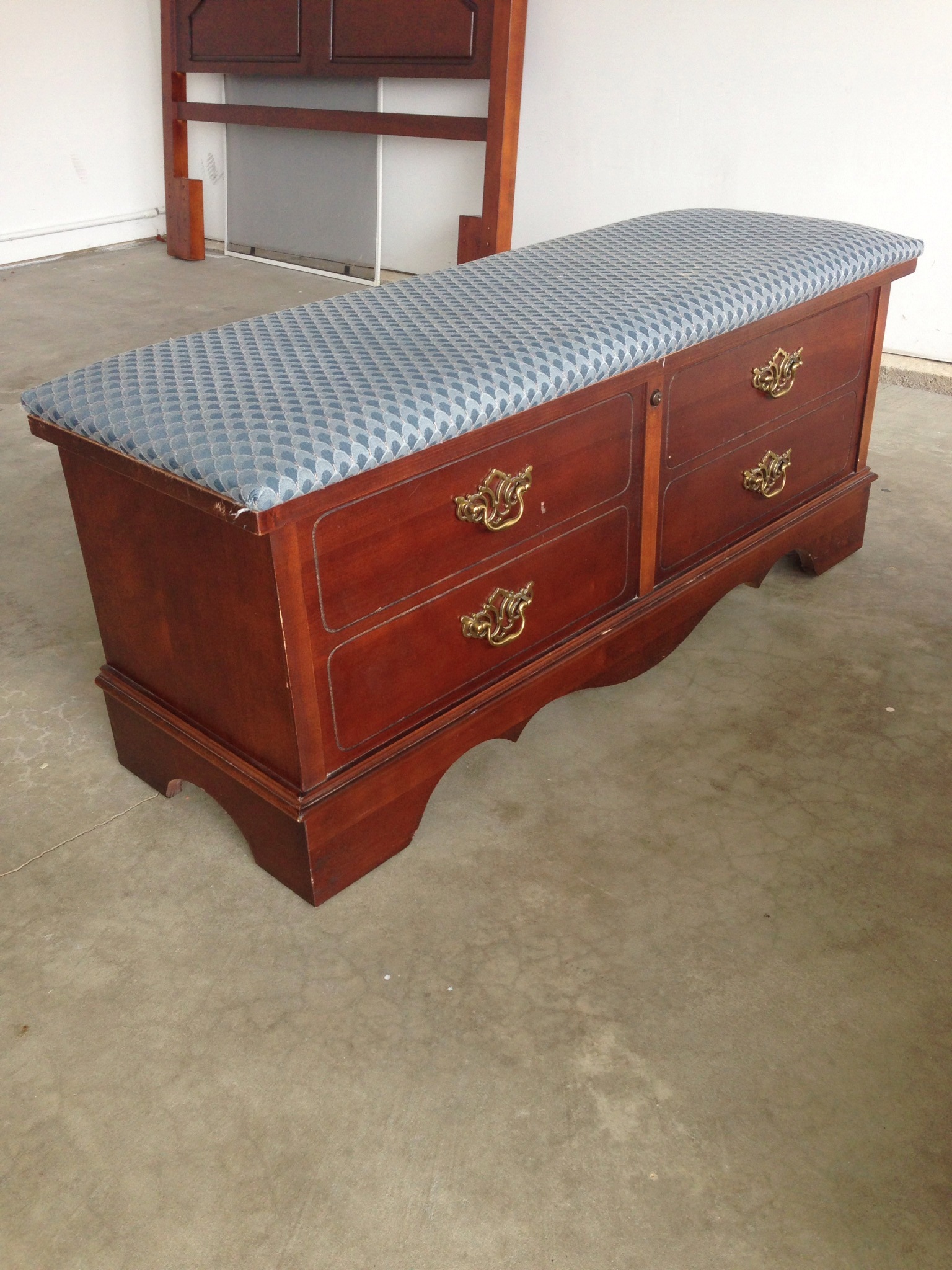 Now to reupholster this piece….All I have to say is thank God my Dad was staying with me while he is in transition of moving to Florida. He sat and removed every single staple from the old upholstery. THANK YOU DAD! That was probably the hardest part of this makeover. Once he removed the old fabric we realized that none of the foam or wood could be reused. It was completely shot. My dad took the plywood to Lowe’s and they custom cut two new pieces for us. He then went to Hobby Lobby to pick up new foam. We quickly got to work replacing the entire seat. It is so much more comfortable and sturdy now. I added a decorative trim around the fabric to hide the nails and give it a little more pizazz. I just love the way it turned out. What a difference some paint and new fabric can make. My oldest daughter is trying to hijack this piece for her room. I need to sell it while she is at school:-) I think it would be great as a bench in a living room or entry way. It would be perfect in a mud room as well. Just adorable. Right now it is sitting at the end of my daughters bed and it does look like it belongs there. 🙂 If it doesn’t sell I know it was meant to be right where it sits now.