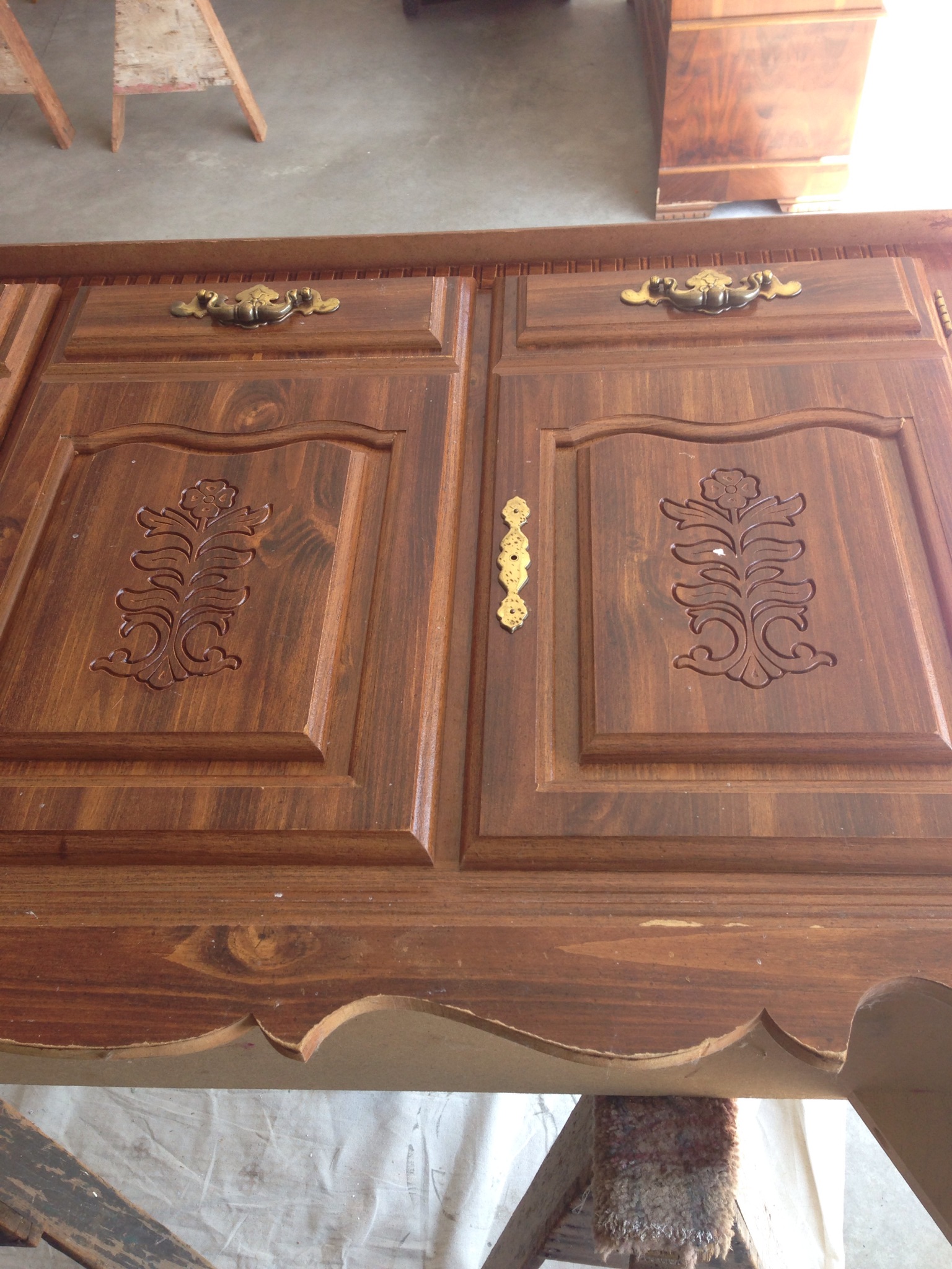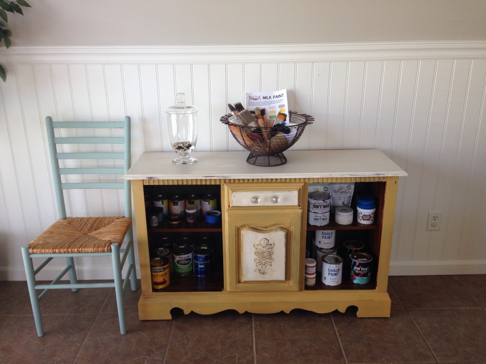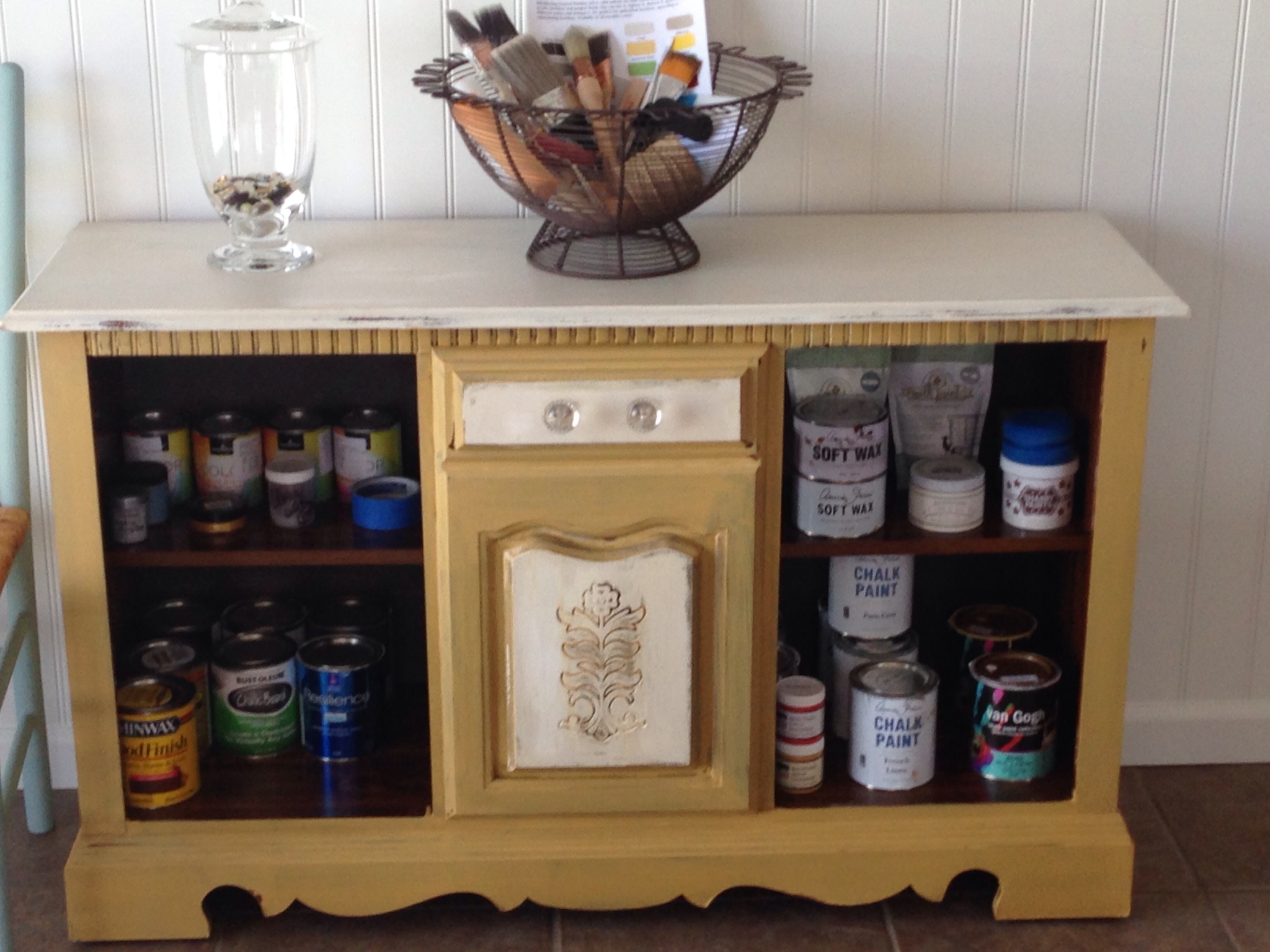 I applied two coats of Annie Sloan Pure White to the entire settee. Once dried I sanded to distress and then applied my favorite wax mixture. I used 1 part Annie Sloan Dark Wax to 2 parts Mineral spirits. This “waters” down the wax and allows you to brush on the entire piece rather than rubbing the wax on. I find that it gives it a more realistic aged effect. Afterwards you simple take a lint free cloth and wipe the wax glaze off. This leaves the finish super smooth. You will still need to add a protective coat of wax.