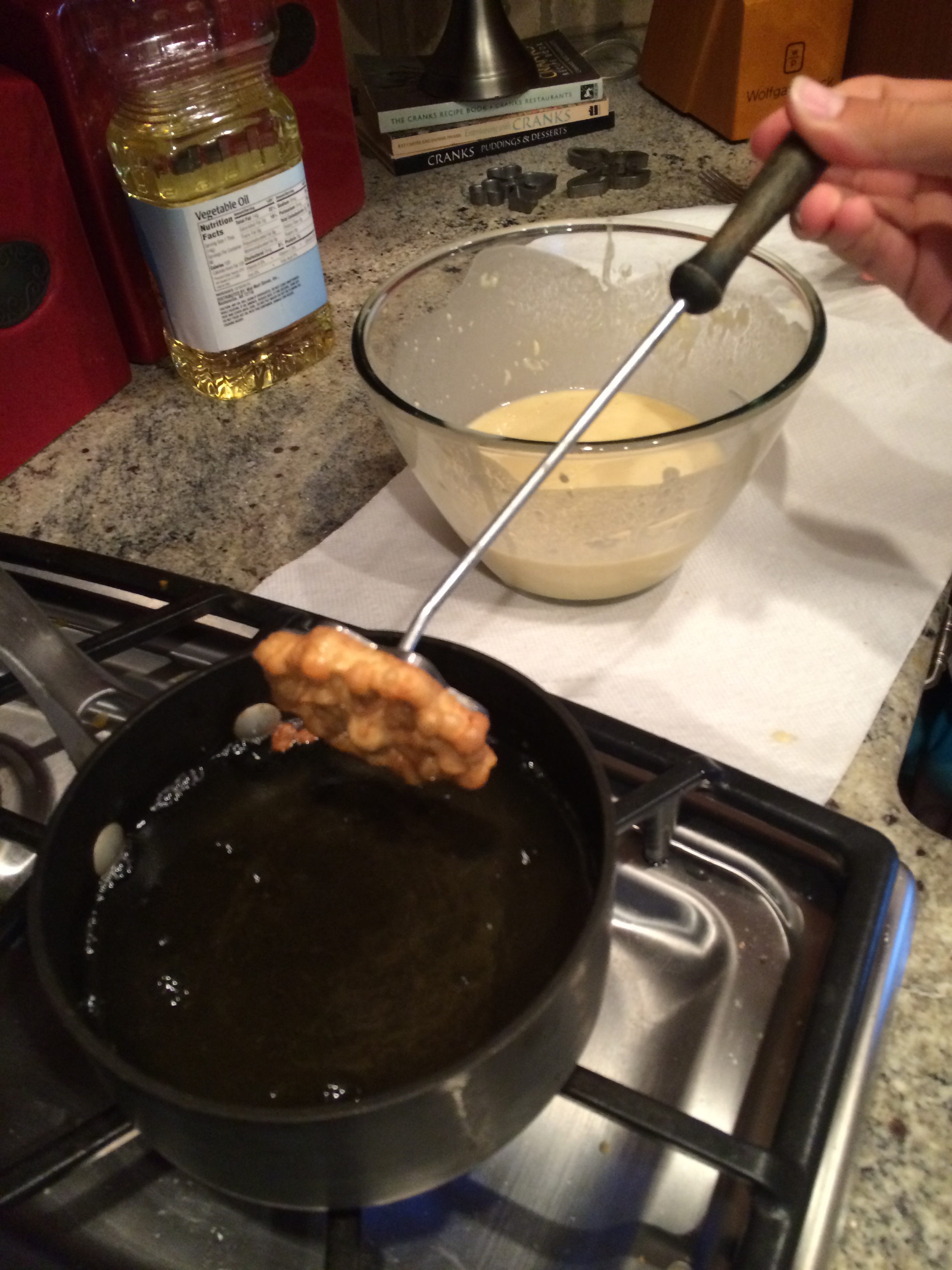 2. Heat oil to 400 degrees in deep saucepan or electric skillet (I use a small, heavy pot that I don’t mind ruining.) Heat iron in hot oil; drain excess oil on paper toweling. Dip heated iron into batter until mold is 2/3 covered.Â
